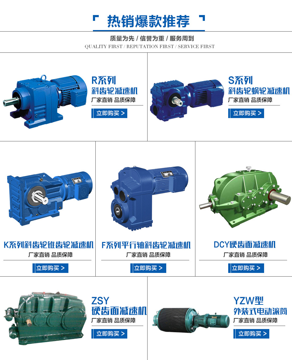 我廠主打產(chǎn)品為R、S、K、F系列斜齒輪減速機(jī),ZSY、ZLYJ、ZD重型齒輪減速機(jī),B、X系列擺線針輪減速機(jī),WP、NMRV蝸輪蝸桿減速機(jī),P系列行星減速機(jī),TDY電滾筒及各種非標(biāo)減速機(jī).廣泛應(yīng)用于制金.包裝,紡織,塑料機(jī)械,化工.電工機(jī)械等眾多行業(yè)。